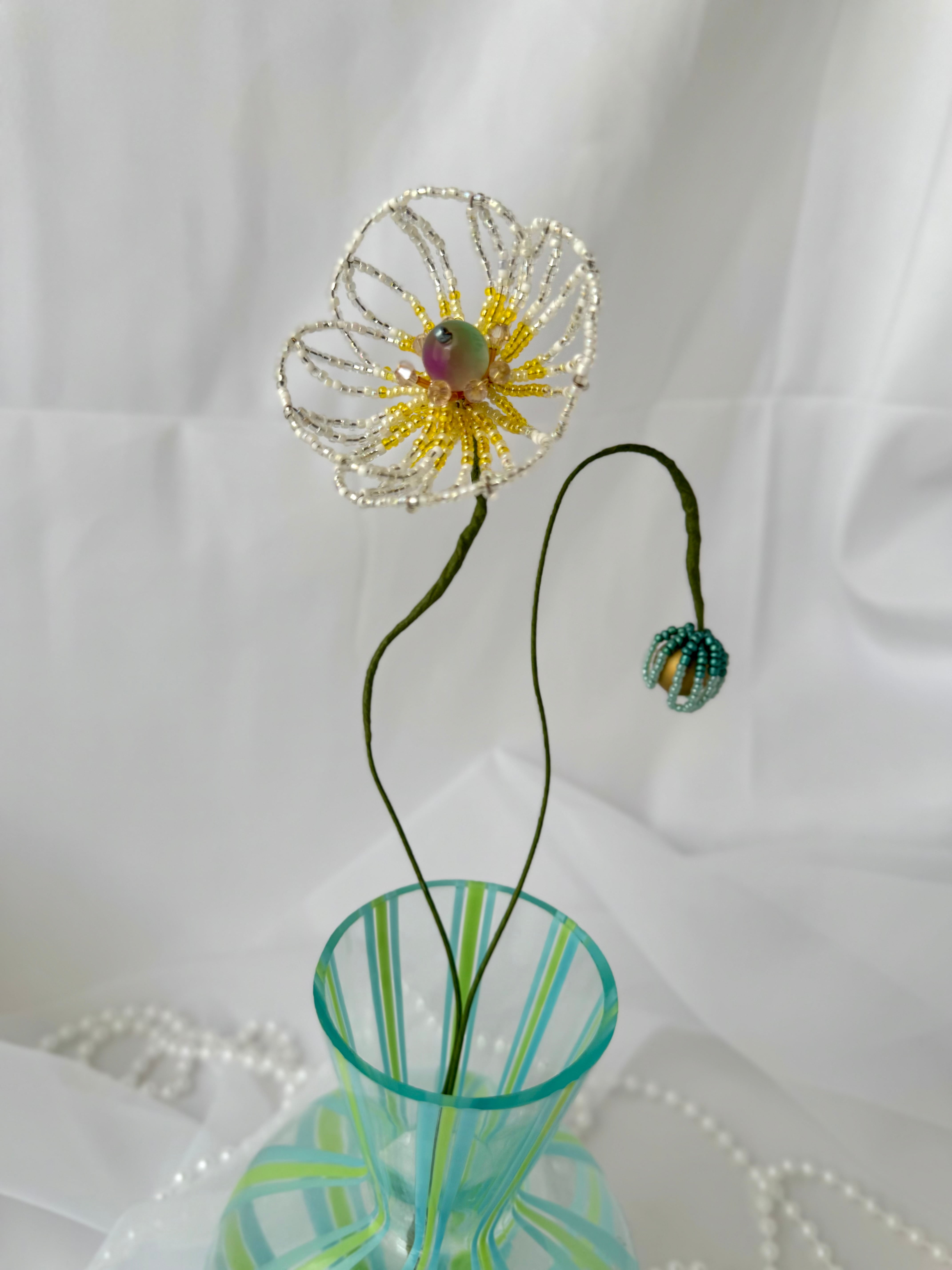 ※ビーズフラワーはデザイン上重心が上部(花びらの部分)にあるため花瓶等にさしてお使いの場合は重みによって転倒の恐れがあります。製品より重みのある花瓶をお選びいただくか両面テープなどで花瓶の底部を固定してお使いいただくことをお勧めいたします。尚、転倒によって花瓶を含めた家具家財を損傷した場合の補償はございません。