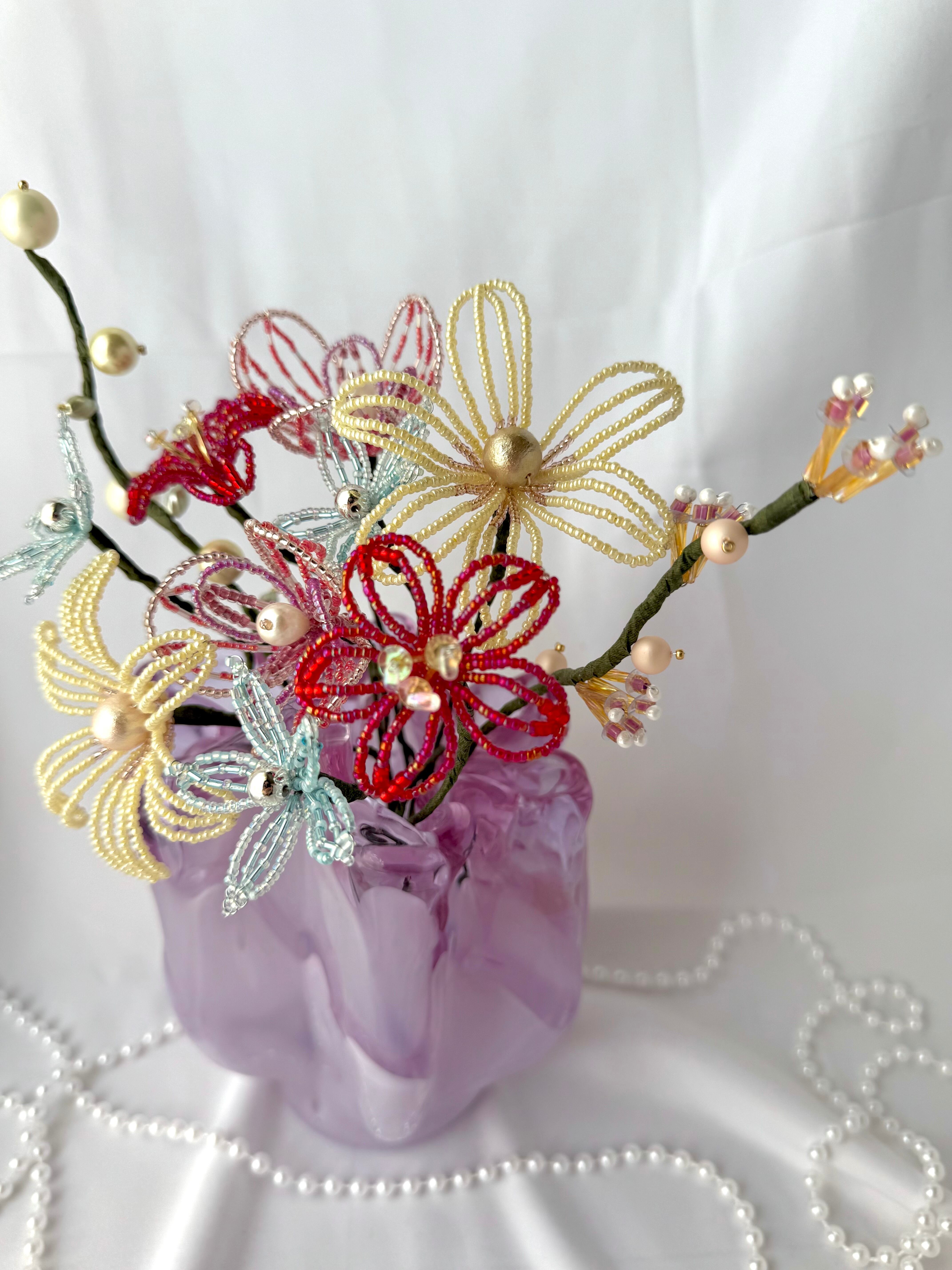 ※ビーズフラワーはデザイン上重心が上部(花びらの部分)にあるため花瓶等にさしてお使いの場合は重みによって転倒の恐れがあります。製品より重みのある花瓶をお選びいただくか両面テープなどで花瓶の底部を固定してお使いいただくことをお勧めいたします。尚、転倒によって花瓶を含めた家具家財を損傷した場合の補償はございません。