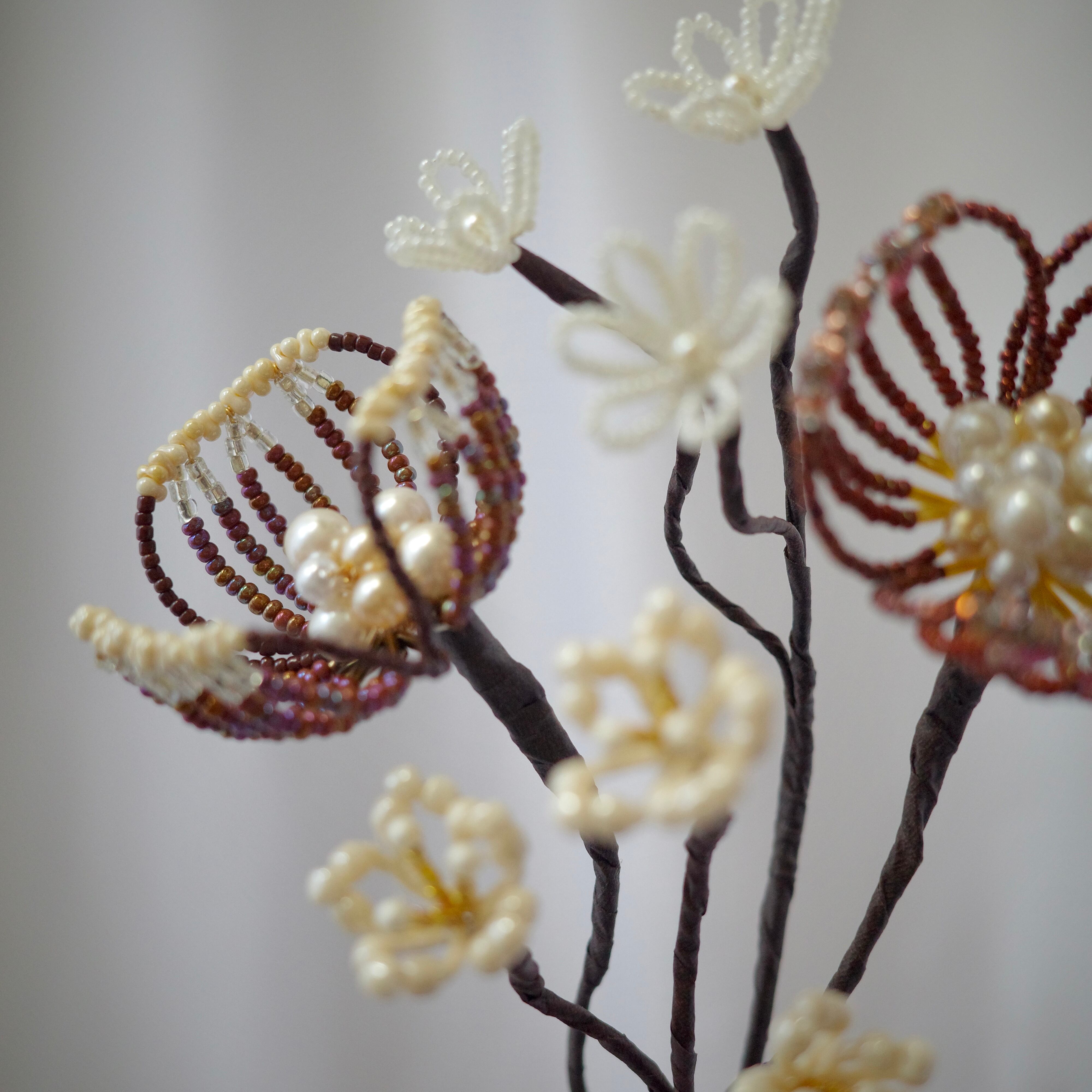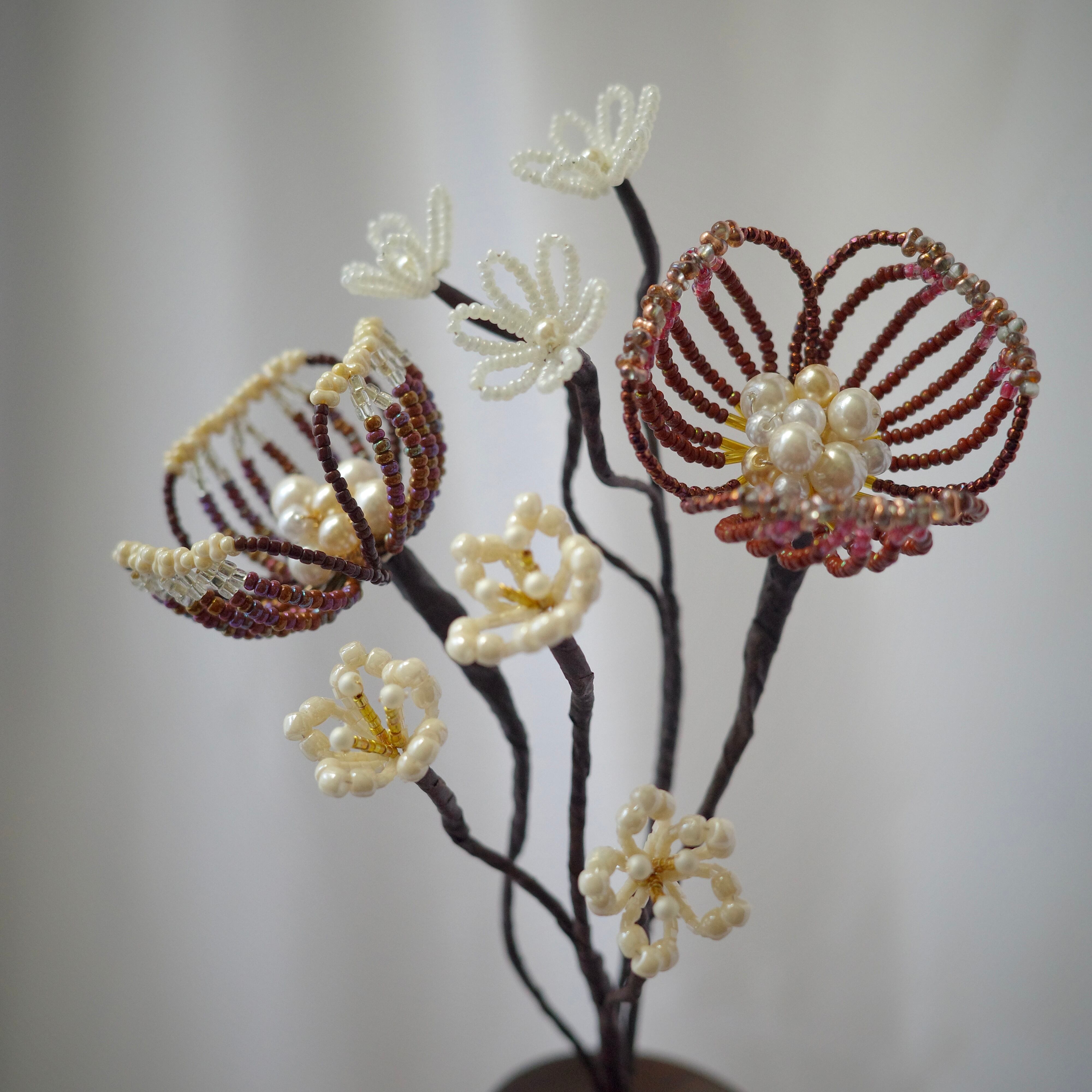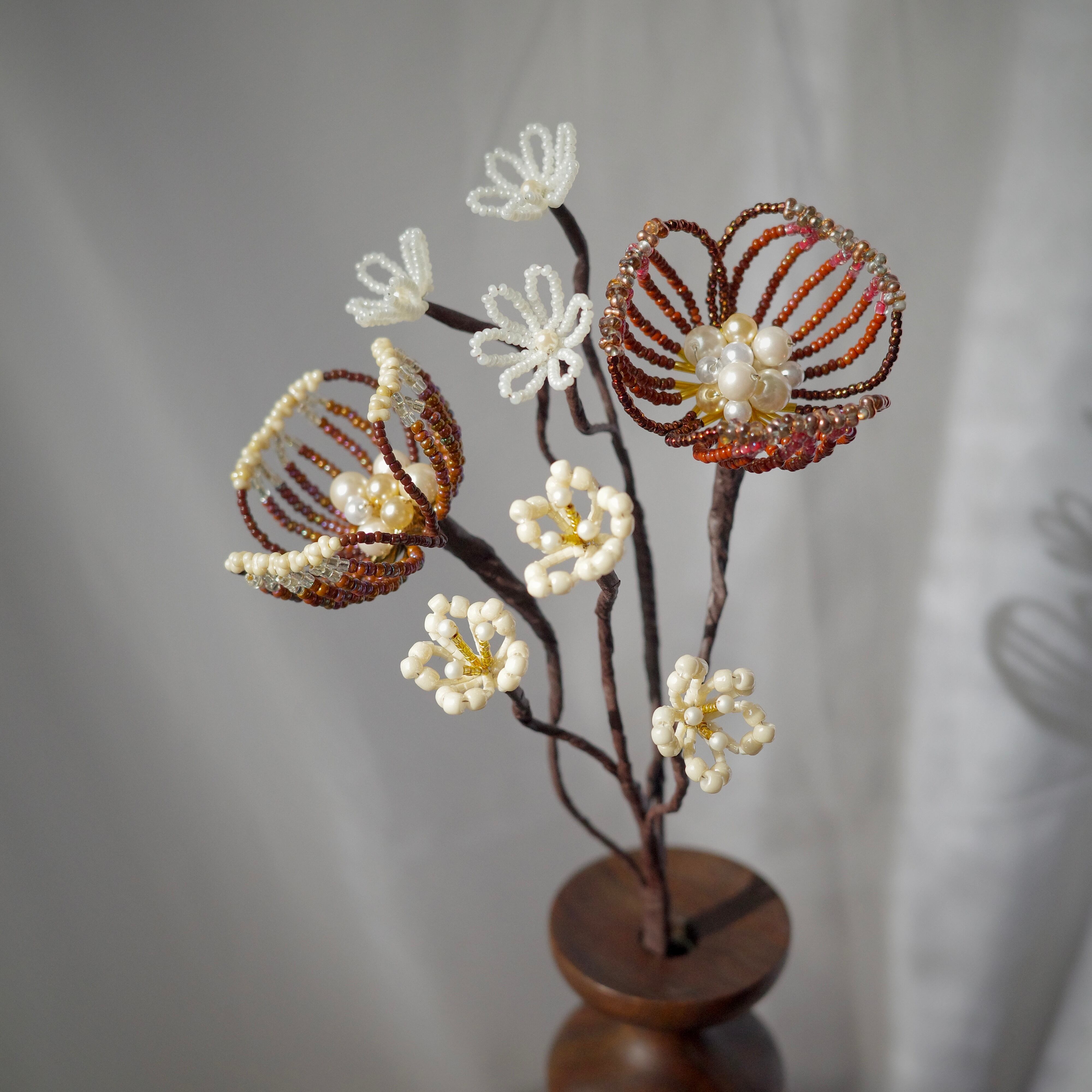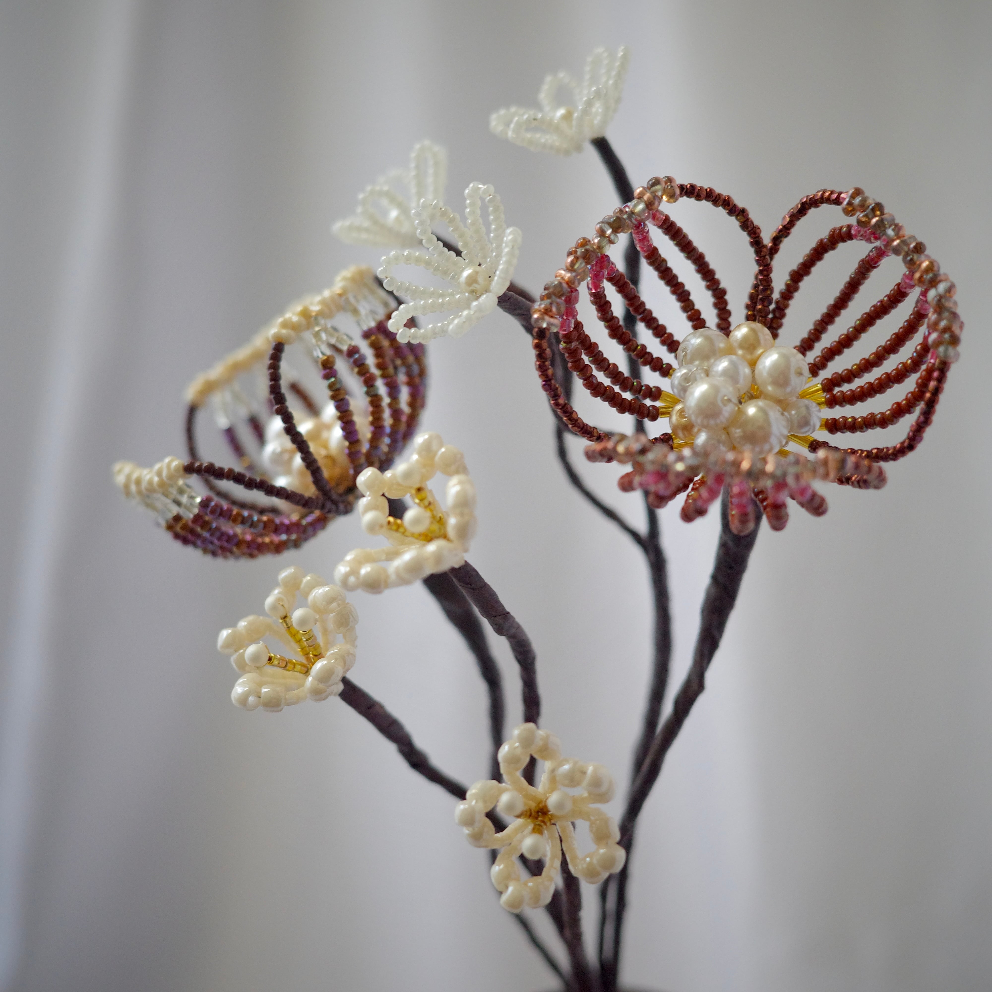 ※ビーズはガラス製のため太陽光のもと長期間保管すると色褪せの原因になります。屋外等でのご使用はお控えください。またワイヤー(針金)には金属を使用しているため湿度の高いお部屋には置かないでください。