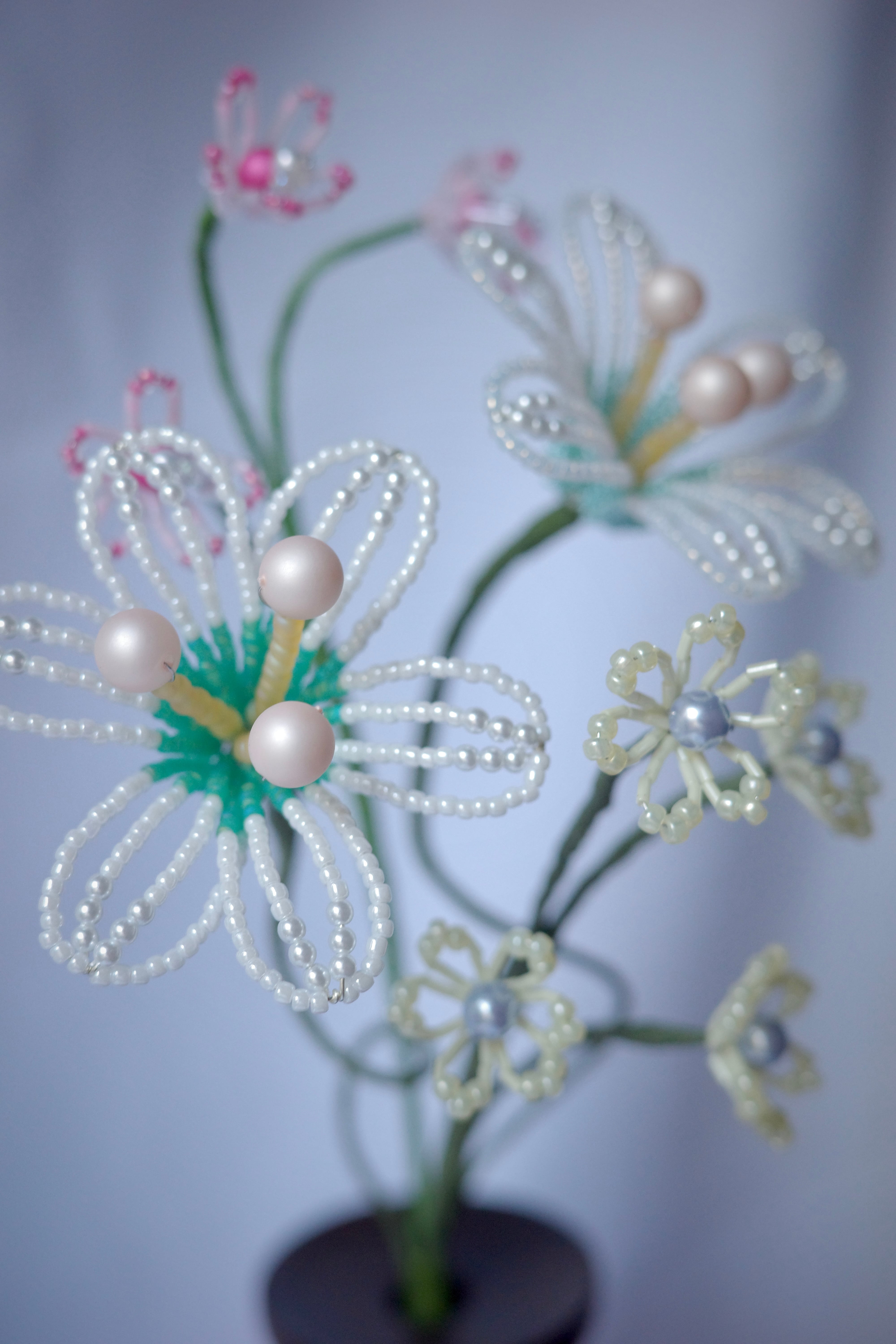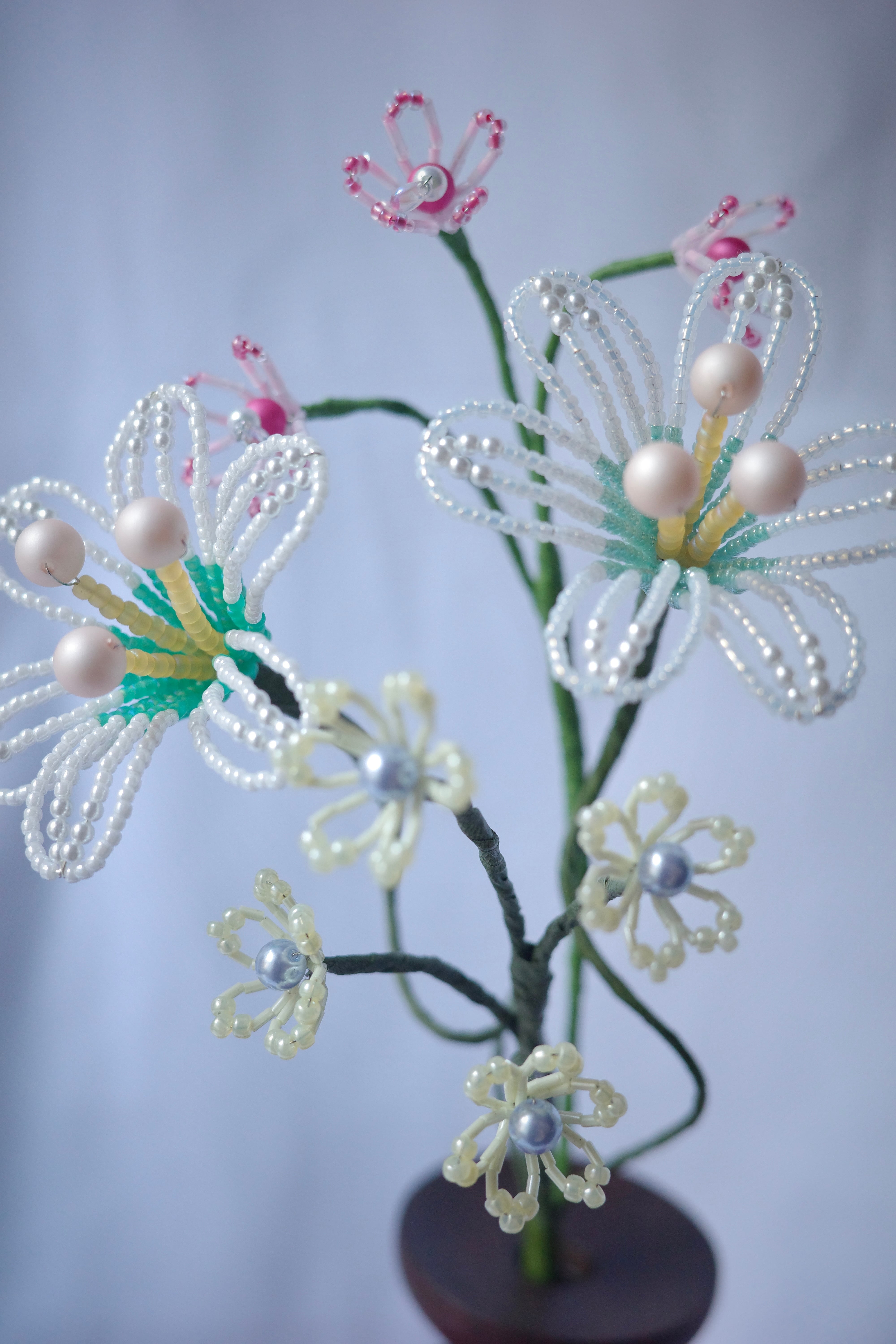 ※ビーズはガラス製のため太陽光のもと長期間保管すると色褪せの原因になります。屋外等でのご使用はお控えください。またワイヤー(針金)には金属を使用しているため湿度の高いお部屋には置かないでください。