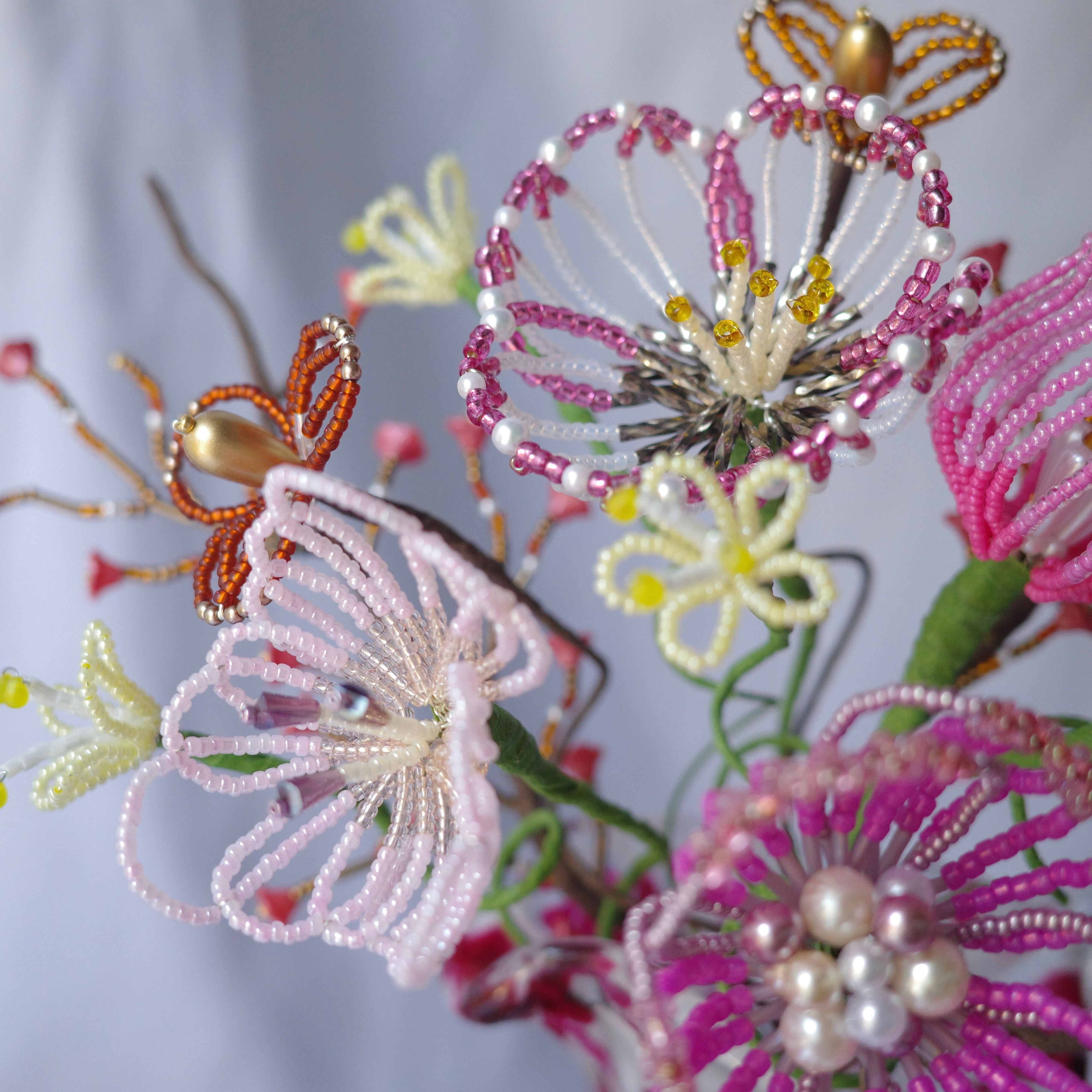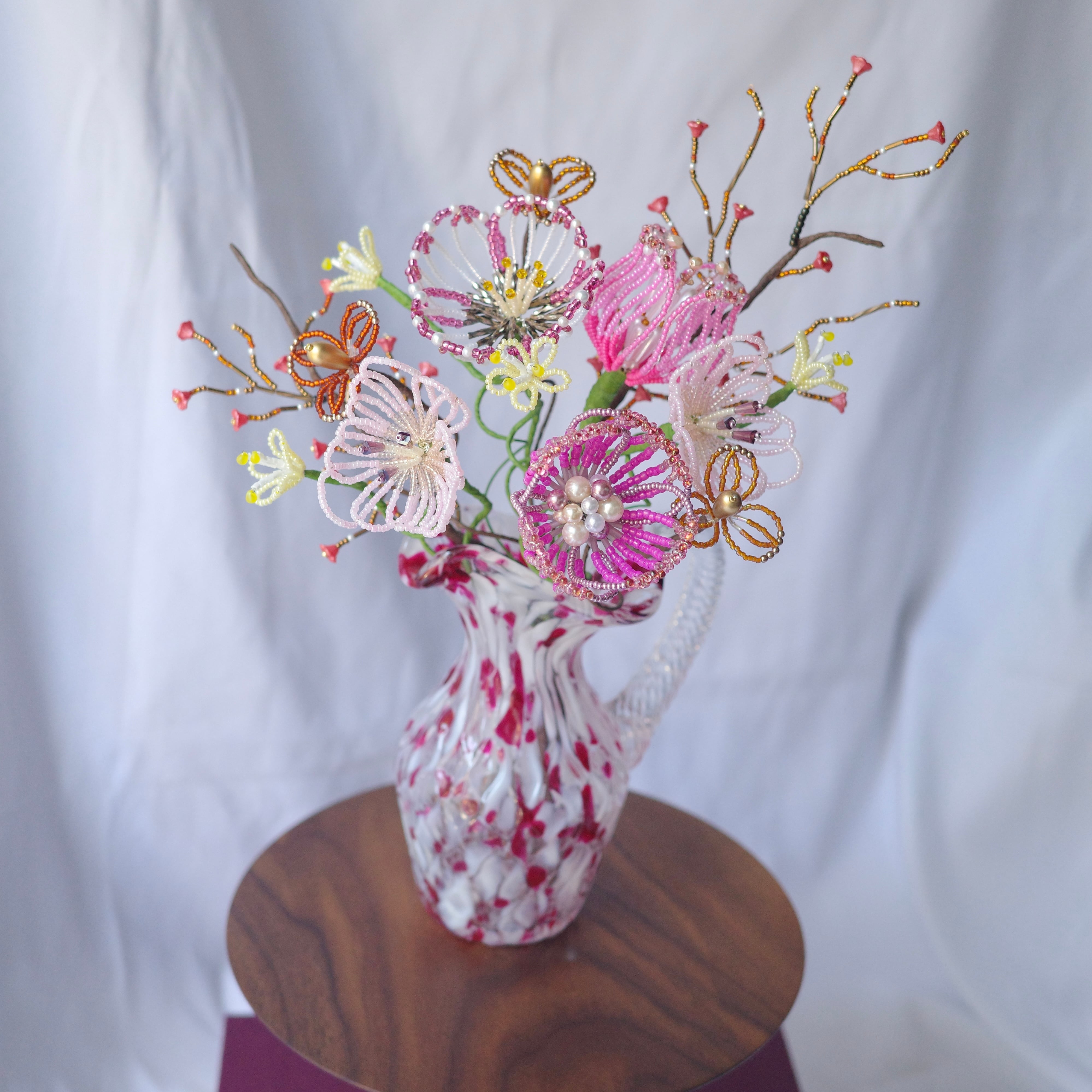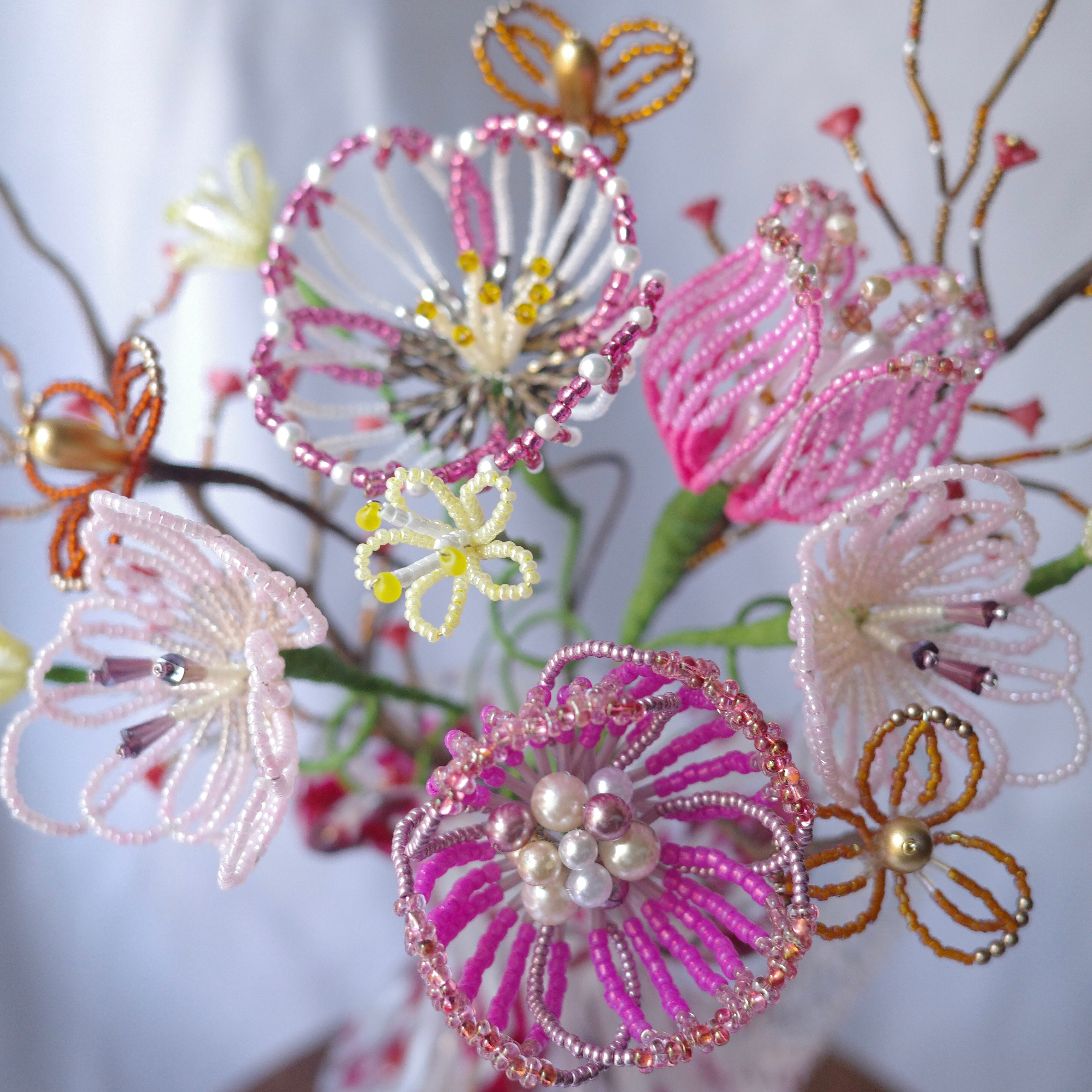 ※ビーズはガラス製のため太陽光のもと長期間保管すると色褪せの原因になります。屋外等でのご使用はお控えください。またワイヤー(針金)には金属を使用しているため湿度の高いお部屋には置かないでください。