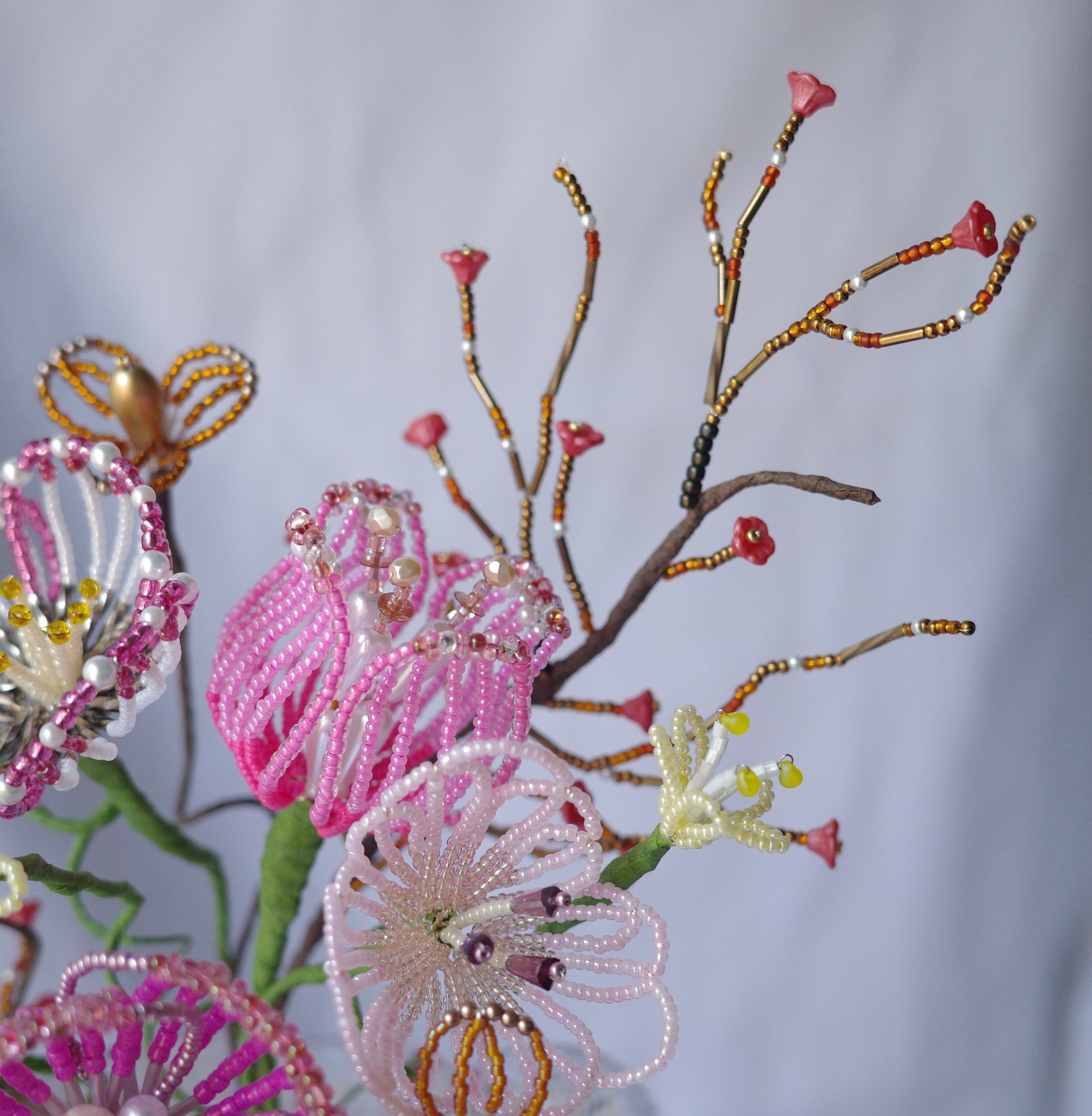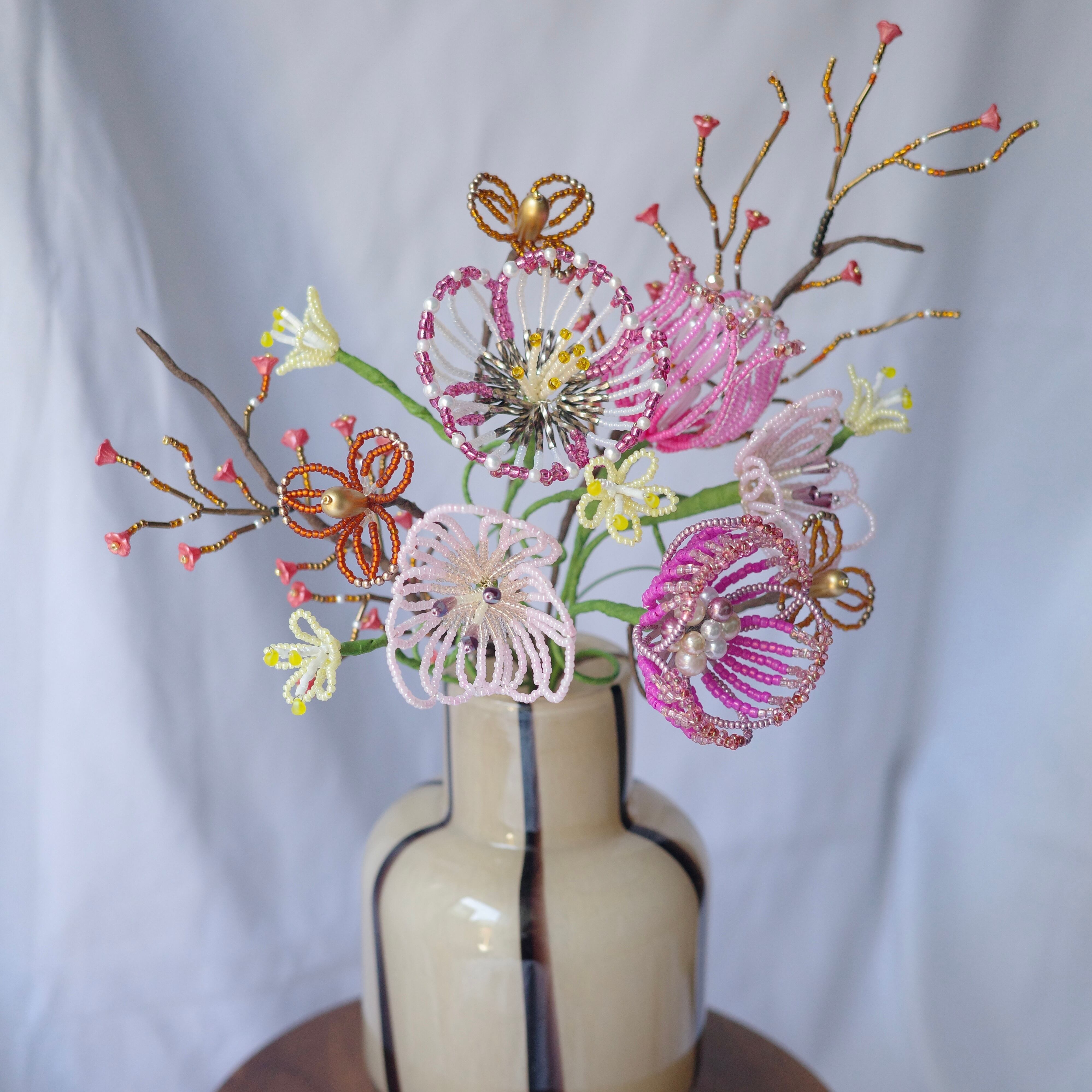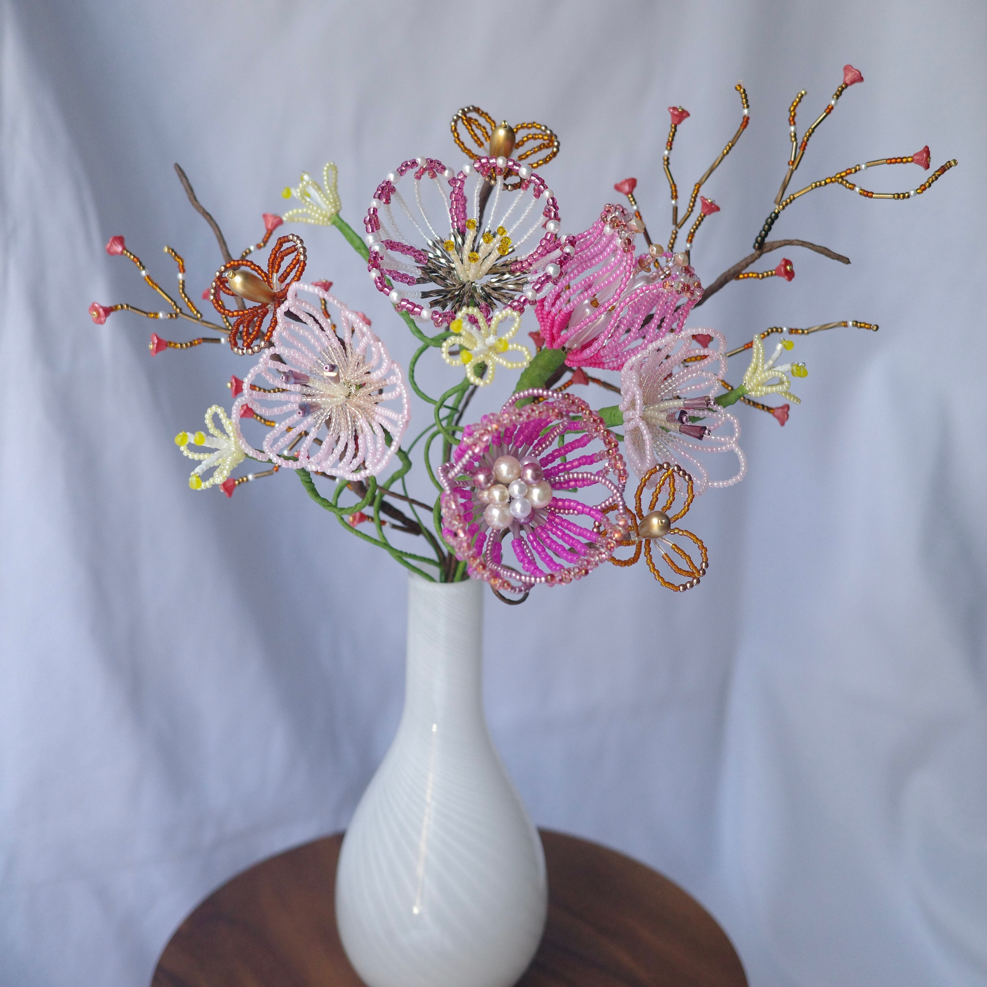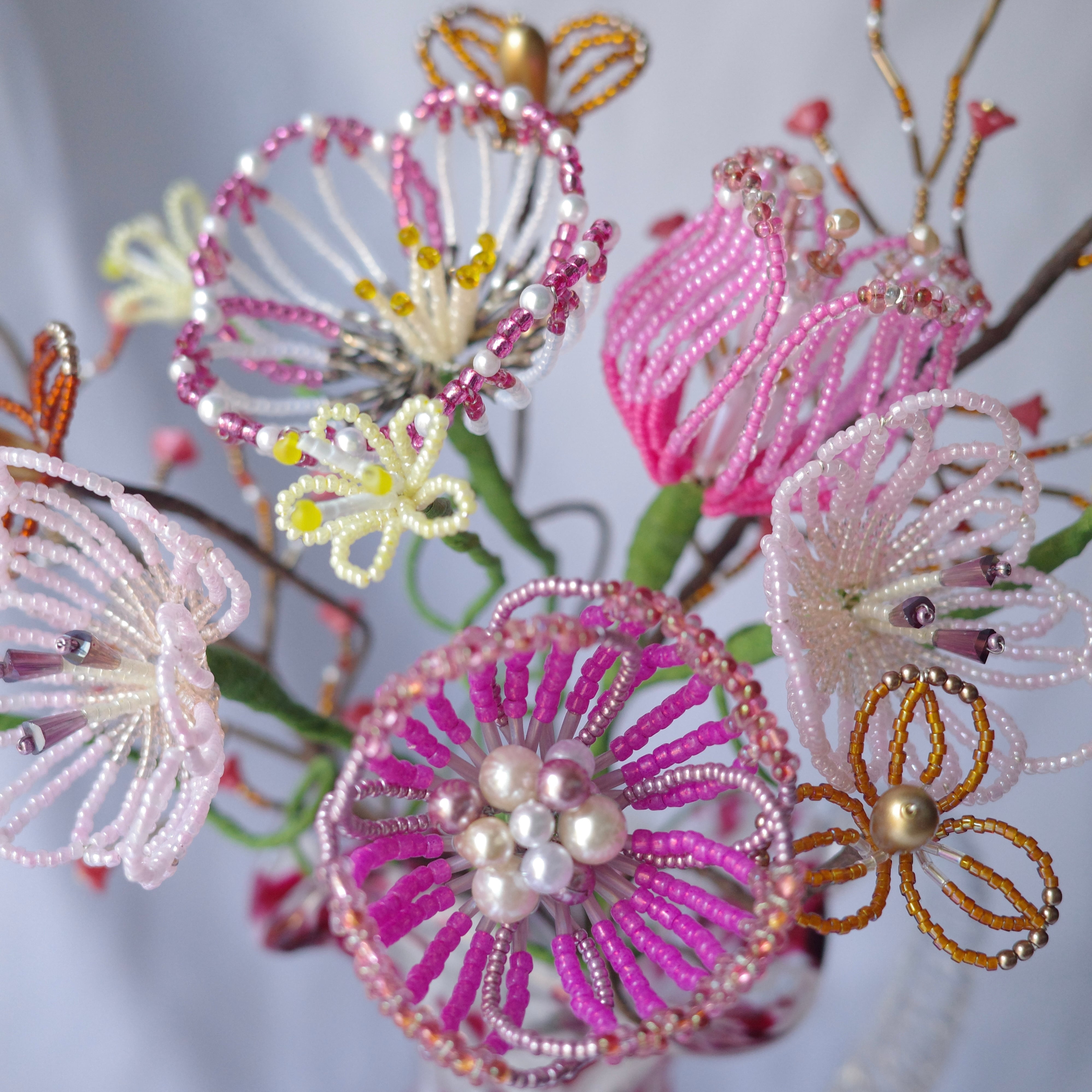 ※ビーズはガラス製のため太陽光のもと長期間保管すると色褪せの原因になります。屋外等でのご使用はお控えください。またワイヤー(針金)には金属を使用しているため湿度の高いお部屋には置かないでください。