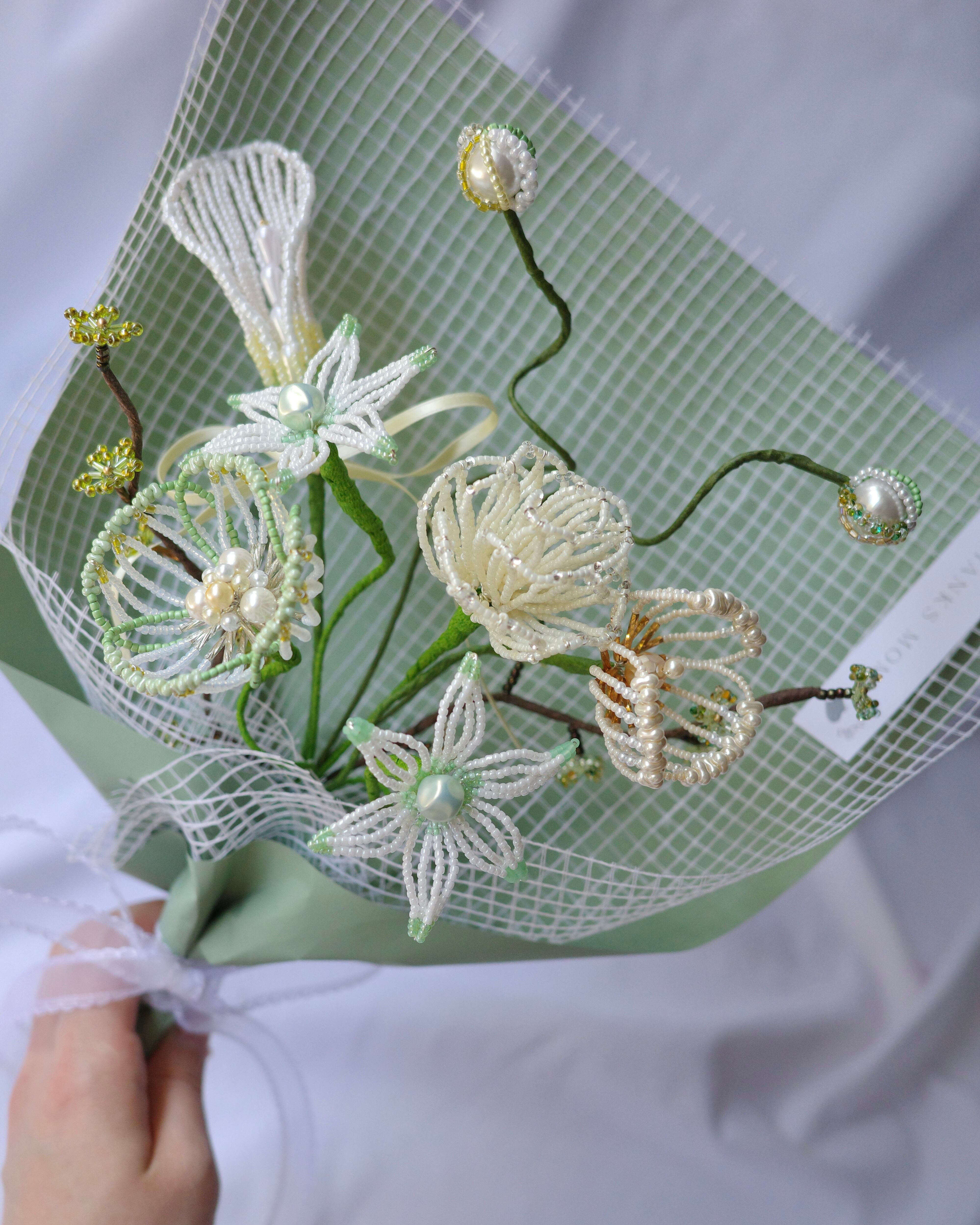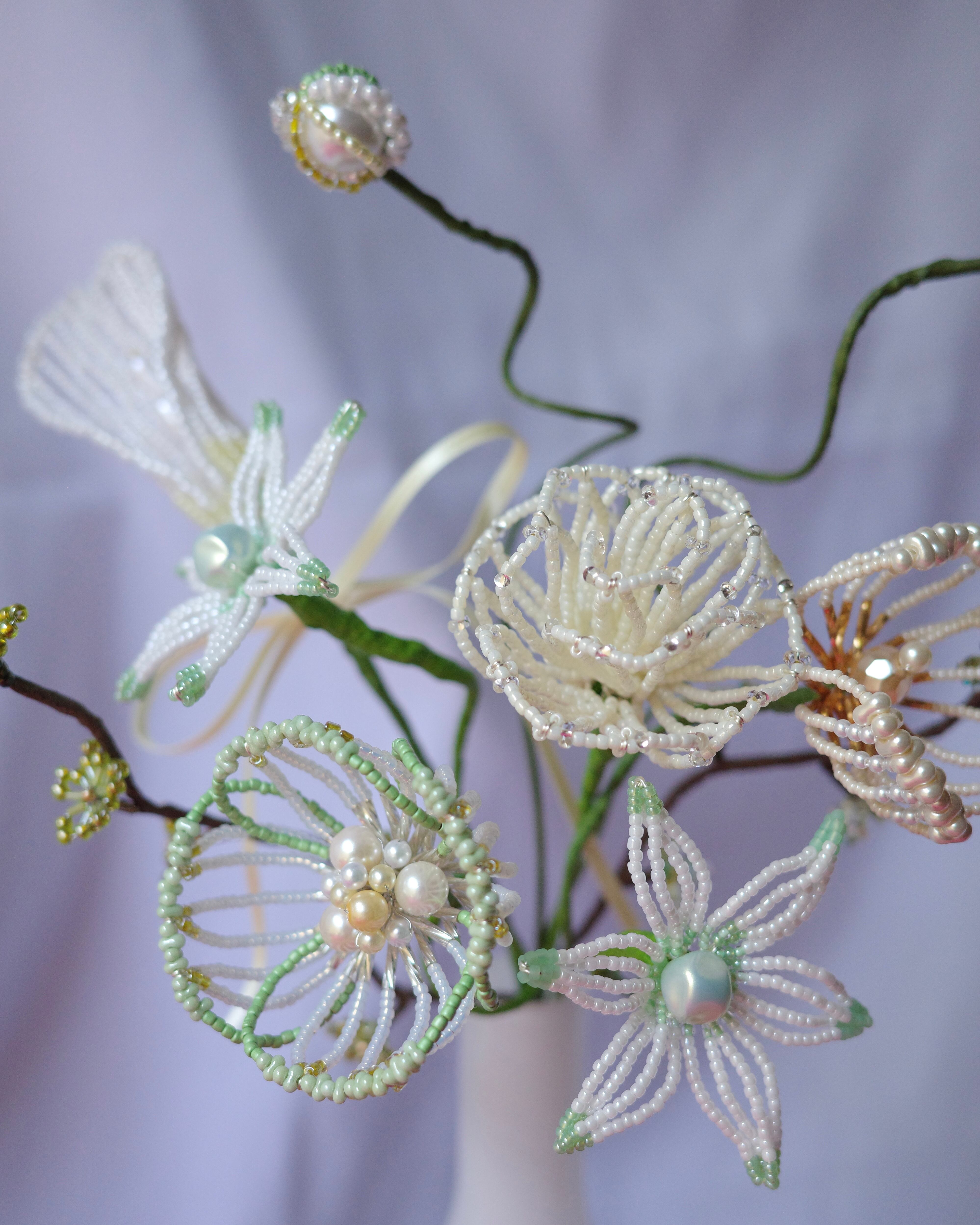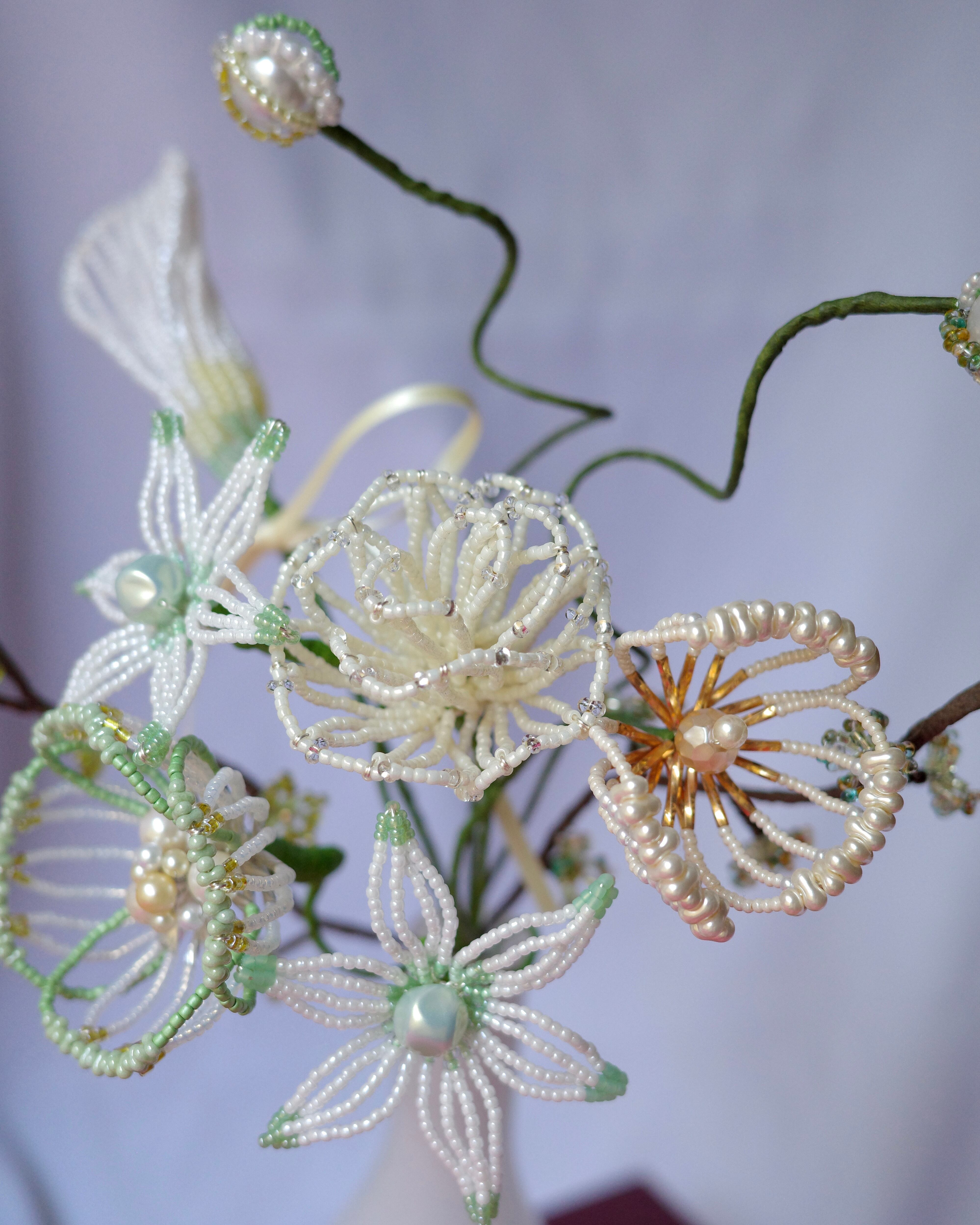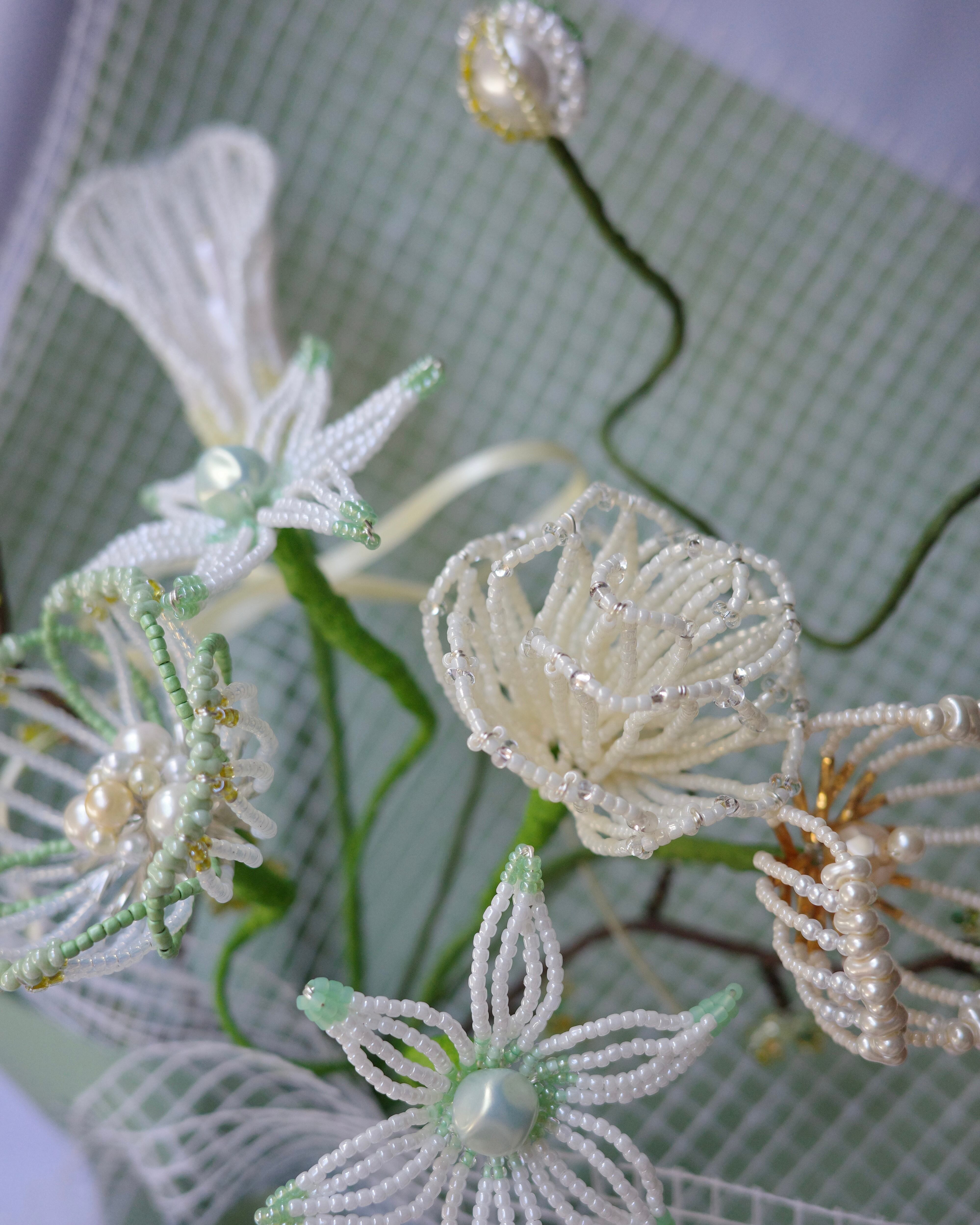 ※ビーズはガラス製のため太陽光のもと長期間保管すると色褪せの原因になります。屋外等でのご使用はお控えください。またワイヤー(針金)には金属を使用しているため湿度の高いお部屋には置かないでください。